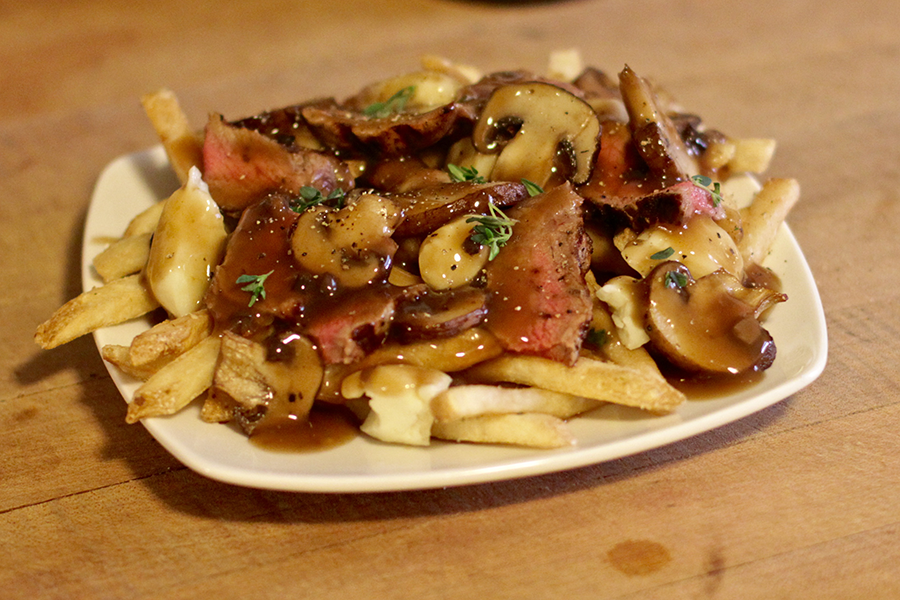 Season to taste and serve over fries with cheese curds with grilled steak and garnish with fresh thyme.